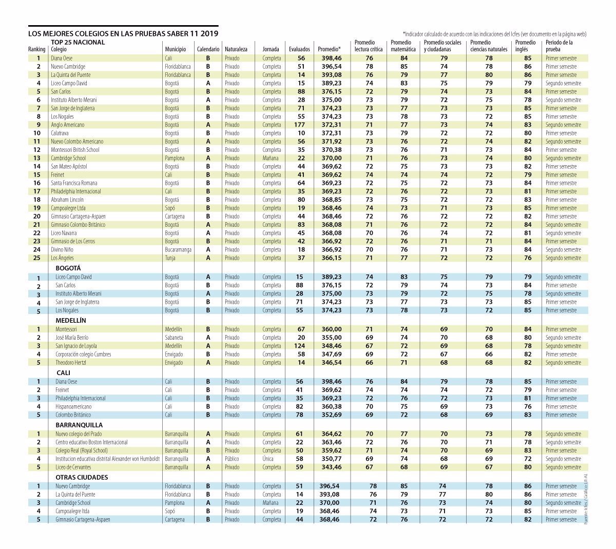 A continuación, les dejamos el ranking presentado por La República, de los mejores colegios, por ciudad, según los resultados de estas pruebas en el 2019.